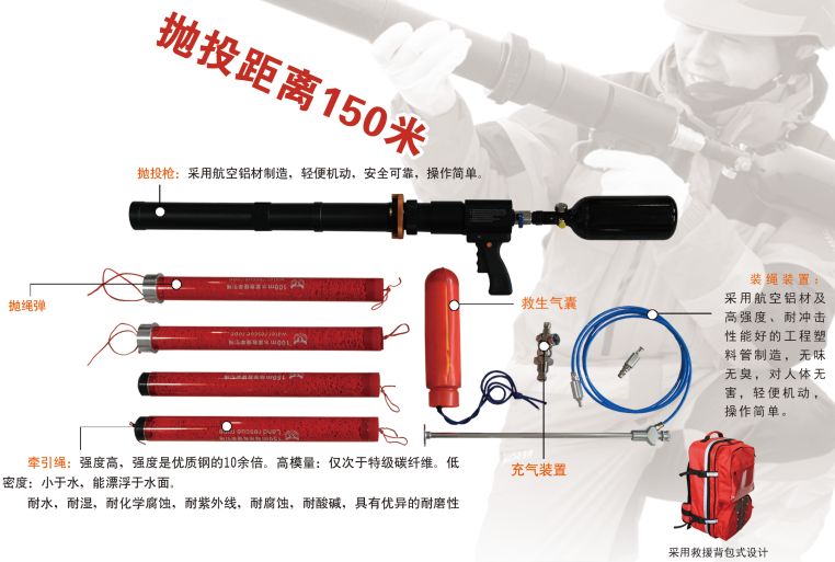 陆上作业:适用于民用、警用、军用。包括楼对楼、地对楼(高空)抛投作业、电力及通讯等线路架设、峡谷山涧等高难度救援场所的抛绳作业、海事部门及水上救捞部门抢险救援、抗洪救灾,尤其适用在电力中断或车辆无法到达等灾害事故现场,可将牵引绳发射至指定位置。